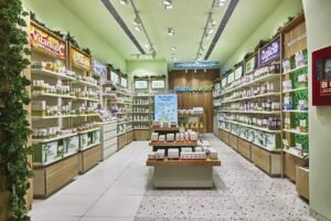 Fixture integrated lighting helps in the convenience of good visibility, access, and inspection of the store offerings… A makeup counter helps in the trying and selection of their colour cosmetics. The service point at the rear of the store houses a much need gifting station and provision for impulse offerings. A ‘skylight’ above the service station helps visually bring a connection of the store concept with the foundation of the brand – Mother Nature.