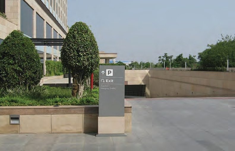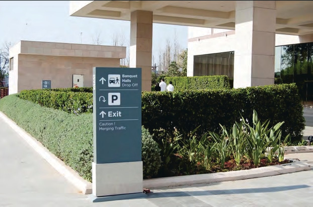 Exterior signs are powder-coated aluminium cabinet displays with stone veneer base. All texts and icons are punched through aluminium sheet and internally illuminated with LED exterior grade lamps.