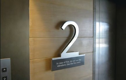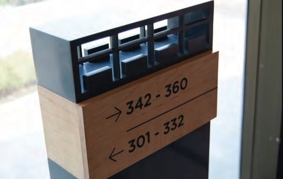 Interior signs are in solid beechwood, Corian and stainless steel. All text screens are printed onto wood surface.