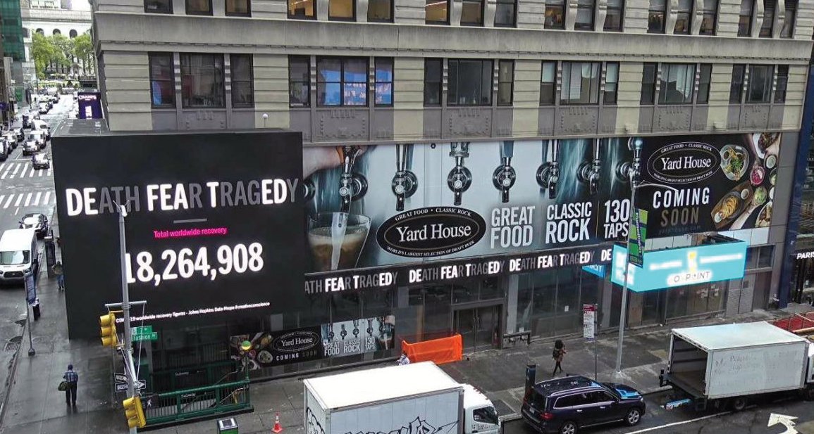 As the world continues to recover from the widespread pandemic scare, Foxpoint and Voodooh teamed up to broadcast a positive message. Arizona-based Foxpoint is Foxpoint is a rapidly growing outdoor advertising company and Voodooh is a dynamic DOOH content production company. Voodooh created a campaign that tapped into live and rising ‘Total Worldwide Recovery’ numbers of COVID-19 provided by John Hopkins Data. Foxpoint displayed the campaign on their 10 Times Square location. The unique creative highlighted letters from the words ‘DEATH FEAR TRAGEDY’ to spell out ‘DEFEATED’ which promotes a positive outlook.