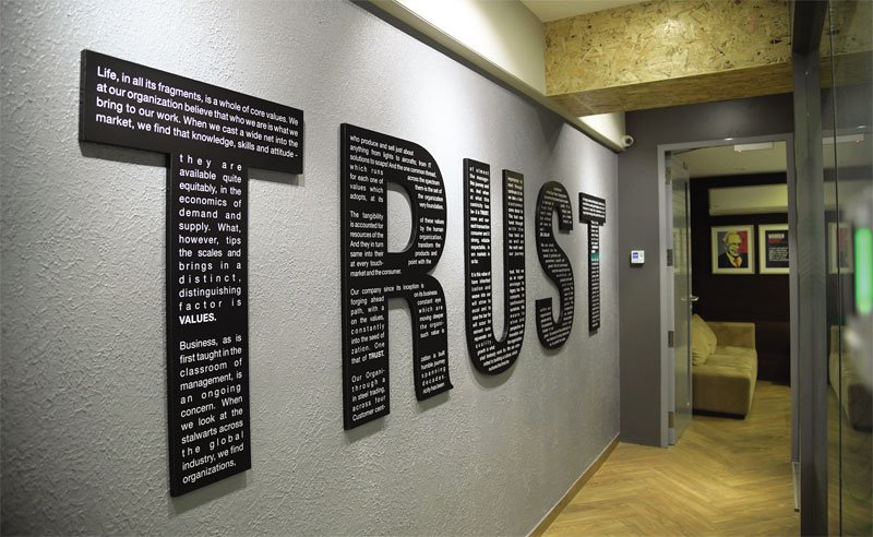 The core values like trust & quality were integrated with the interior’s in the form of fittings, quotes and messages on the pillars. However, a wooden installation of the letters ‘TRUST’ etched with the company’s philosophy at the entryway leading to the senior management’s floor remains a distinct feature of the workspace.