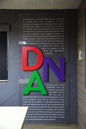 The design team further decided to highlight the company’s DNA in the conference room, using wooden letter cut-outs of the word ‘DNA’ in the three primary brand colours carefully etched onto the acrylic sheet.