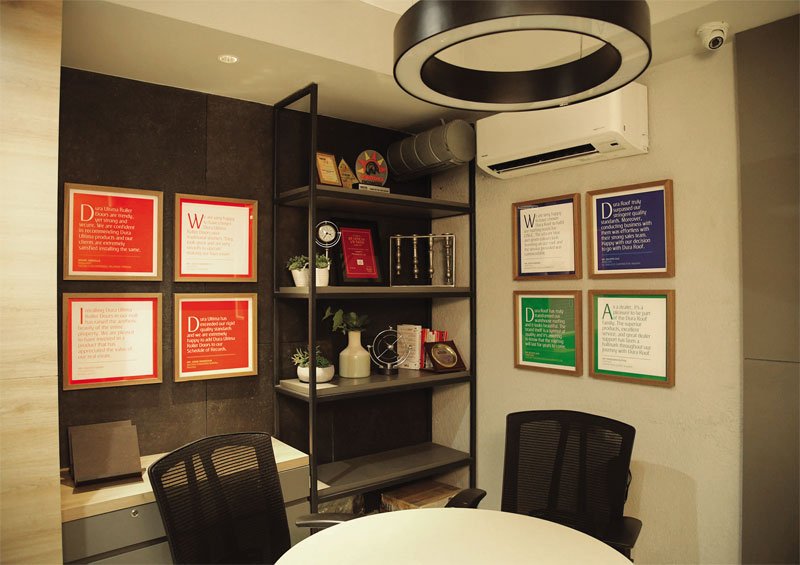 The antechamber sets the tone for the corporate office, where OH! Design Studio crafted and installed an illustration depicting a city which is protected and secured with roofs and shutters in the brand colours of Dura Roof and Dura Ultima. This holds deep meaning for the company, reflecting their vision to keep the living space of their customers safe and secure.