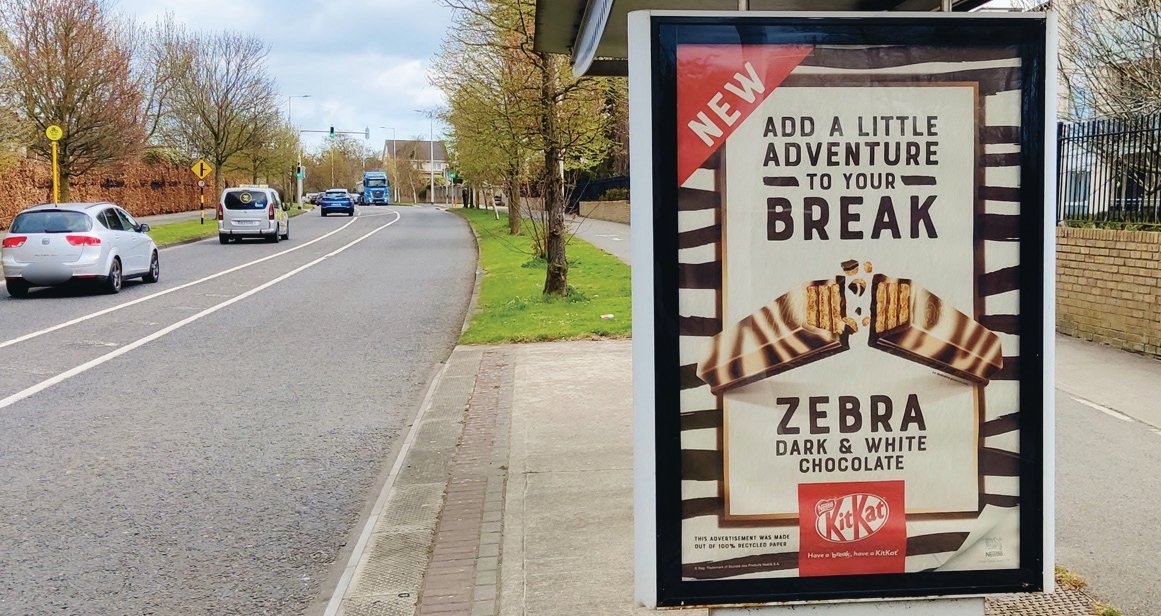 Nestlé Ireland has become the first advertiser in the Irish market to use 100 percent recycled paper for an outdoor advertising campaign. As part of a joint commitment between Nestlé Ireland and location-based marketing specialist PML Group, to improve sustainability in OOH advertising, the campaign KitKat Zebra, has used green printing techniques on 100 percent recycled paper. Unlike current processes, this new recycled paper collects used paper which has the ink removed and is pulped prior to reaching the papermaking stage. Complementing the 6 Sheet formats, the campaign, planned by Source out of home and Mindshare, is also displaying on Digishelters located in busy footfall areas across Dublin.