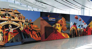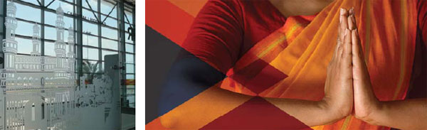 Rows of graceful south Indian classical dancers greet international passengers on arrival at the Immigration Hall. A graphic of distinctive landmarks from across the region that come together depicts a unique south Indian skyline at the International Departures Lounge. An infographic panel at the Domestic Departures Lounge shows distances between Hyderabad and other Indian and international cities to engage the interest of passengers.