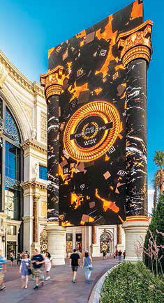 When The Forum Shops at Caesars Palace in Las Vegas Strip opened its doors, what the premier shopping destination revealed was a new, state-of-the-art digital marquee. Conceived and designed by Simon Property Group and built by YESCO, the double-faced sign stands 85 feet tall and is covered with an abundance of Yaham LED panels. The unique sign simulates a classical Roman building façade complete with Corinthian-inspired columns, but with a surface area boasting more than 6,000 sq ft of LED, the one-of-a-kind collossal display that can be programmed to instantly go from replicating an ancient Roman gateway structure to an haute couture fashion runway animation in the blink of an eye. Excluding the two footings, the mammoth structure is 41 feet wide and weighs 158,000 pounds, as more than half of which is steel.