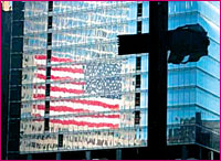 Mindy Kombert and Sherry Kronenfeld, principals in a graphic design business, suspended their business and devoted two years to the ‘Flag of Remembrance’ project. Inspired by the ‘missing persons’ posters around New York City, they created a special American flag to honour the victims and to illustrate the incredible quantities of lives lost. All victims of the horrible attacks are mentioned at the flag with their name, age, and a photograph or a memorial candle instead. In mute tones of red, white or blue the photographs were transferred to fabric, which was supplied by 3P InkJet Textiles Corp. The result is a majestic 27 feet wide and 20 feet high American flag of faces - a memorial for the victims of September 11, 2001 terrorist attacks.