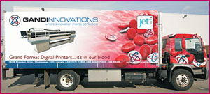 Gandinnovations recently launched their first delivery truck from headquarters in Toronto, Canada, all wrapped up and ready to roll. Vehicle wrap is sharp and striking, even at 30 feet. ‘Grand-format digital printers...it’s in our blood’. Overwhelming demand of sales in the Toronto area spurred the company to purchase the vehicle during the first quarter of 2007.
